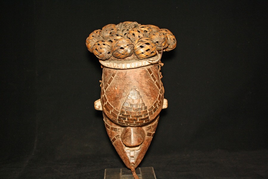 The variety of their masks are surprisingly similar…. with most having aggressive features, most likely because of their warrior society. They are called Mukinka. Most have bulging foreheads, fierce eyes, facial carvings, pegged ears, rectangle open mouth with filed teeth, a fiber chin pendant and a stunning woven/twisted cane knobs coiffure.