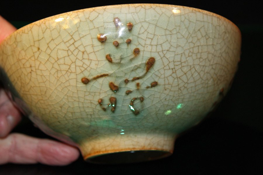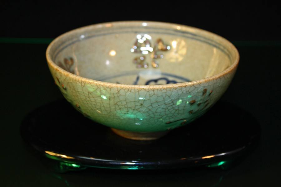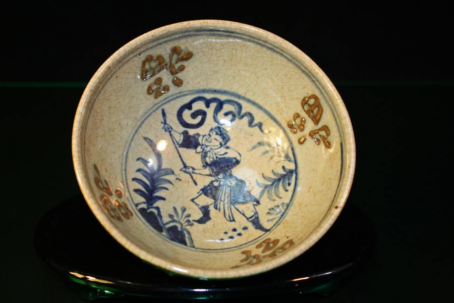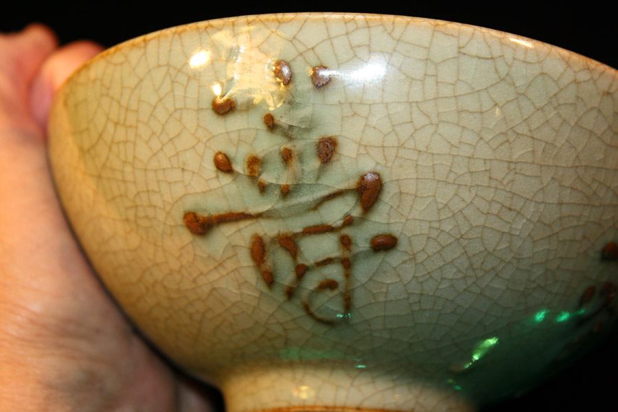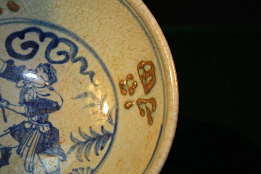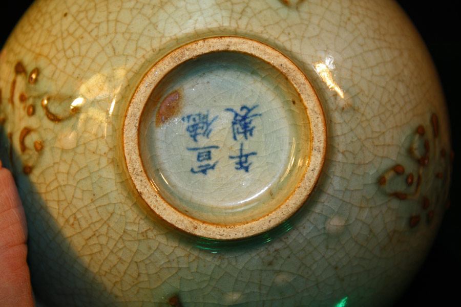 This is a beautiful hand-painted and fired porcelain bowl with raised designs and characters inside the bowl. Signature on bottom.